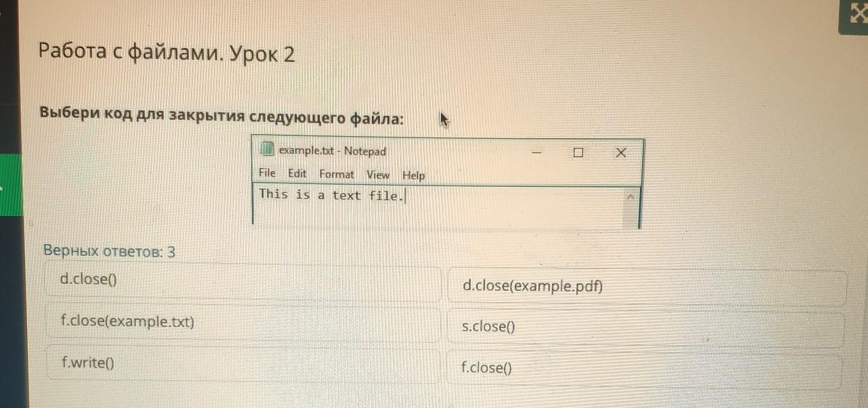 Верными ответами являются: d.close(), s.close() и f.close(), где d,f,s - переменные с именем файла.