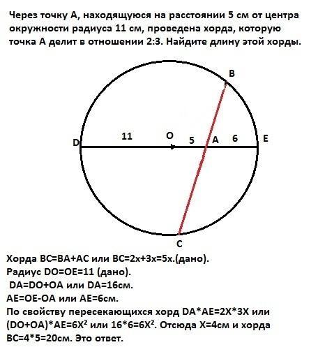 Через точку A, находящуюся на расстоянии 5 см от центра окружности радиуса 11 см, проведена хорда, которую точка A делит на отрезки, длины которых относятся как 2 : 3. Найдите длину этой хорды. Решите пожалуйста очень кратко и понятно