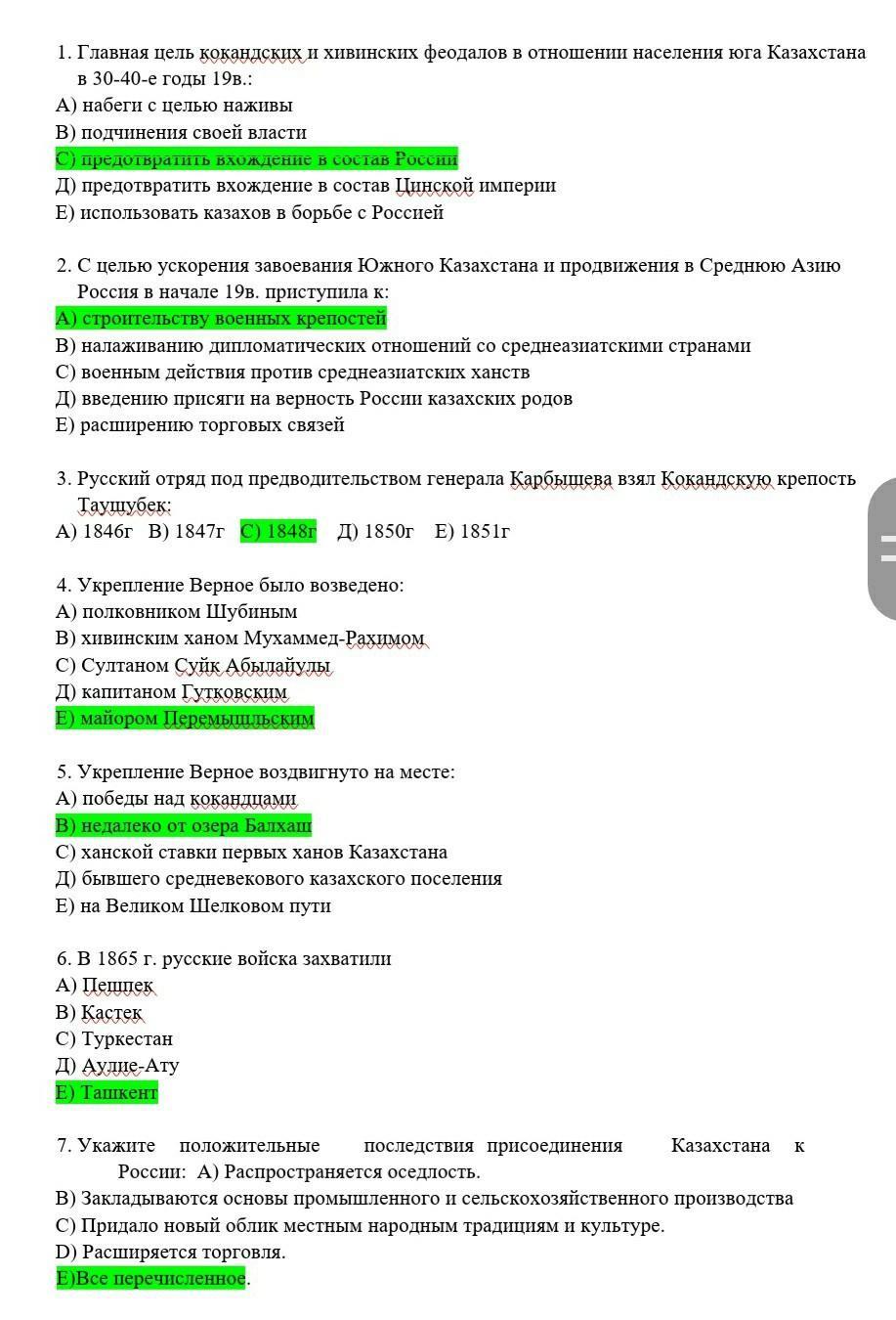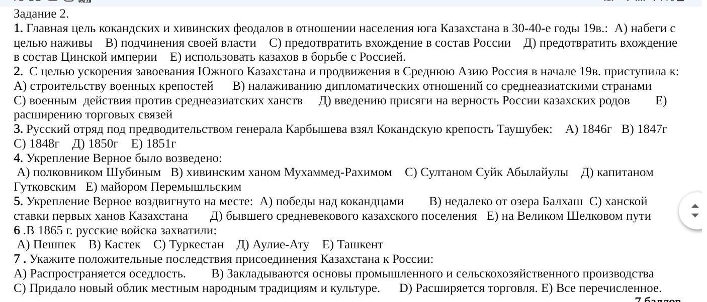 Задание 2. 1. Главная цель кокандских и хивинских феодалов в отношении населения юга Казахстана в 30-40-е годы 19в.: А) набеги с целью наживы В) подчинения своей власти С) предотвратить вхождение в состав России Д) предотвратить вхождение в состав Цинской империи E) использовать казахов в борьбе с Россией. 2. С целью ускорения завоевания Южного Казахстана и продвижения в Среднюю Азию Россия в начале 19в. приступила к: А) строительству военных крепостей В) налаживанию дипломатических отношений со среднеазиатскими странами C) военным действия против среднеазиатских ханств Д) введению присяги на верность России казахских родов E) расширению торговых связей 3. Русский отряд под предводительством генерала Карбышева взял Кокандскую крепость Таушубек: А) 1846г В) 1847 г С) 1848г Д) 1850г Е) 1851 г 4. Укрепление Верное было возведено: А) полковником Шубиным В) хивинским ханом Мухаммед-Рахимом С) Султаном Суйк Абылайулы Д) капитаном Гутковским Е) майором Перемышльским 5. Укрепление Верное воздвигнуто на месте: А) победы над кокандцами В) недалеко от озера Балхаш С) ханской ставки первых ханов Казахстана Д) бывшего средневекового казахского поселения Е) на Великом Шелковом пути 6.В 1865 г. русские войска захватили: А) Пешпек В) Кастек С) Туркестан Д) Аулие-Ату Е) Ташкент 7. Укажите положительные последствия пр нения Казахстана к России: A) Распространяется оседлость. В) Закладываются основы промышленного и сельскохозяйственного производства С) Придало новый облик местным народным традициям и культуре. D) Расширяется торговля. Е) Все