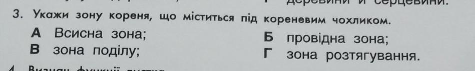 3. Укажи зону кореня, що міститься під кореневим чохликом. A Всисна зона; Б провідна зона; в зона поділу; г зона розтягування.