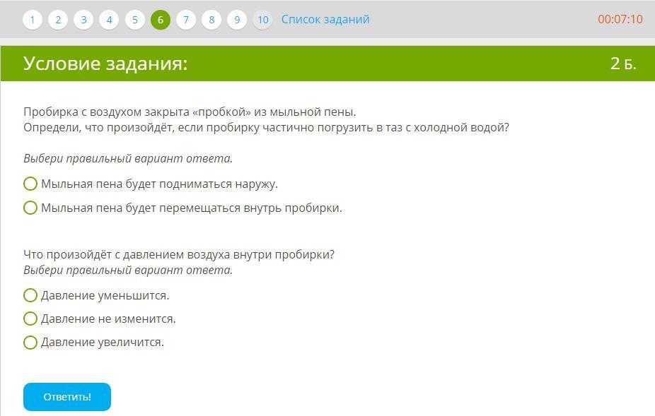 Ответ: 1)О Мыльная пена будет перемещаться внутрь пробирки.