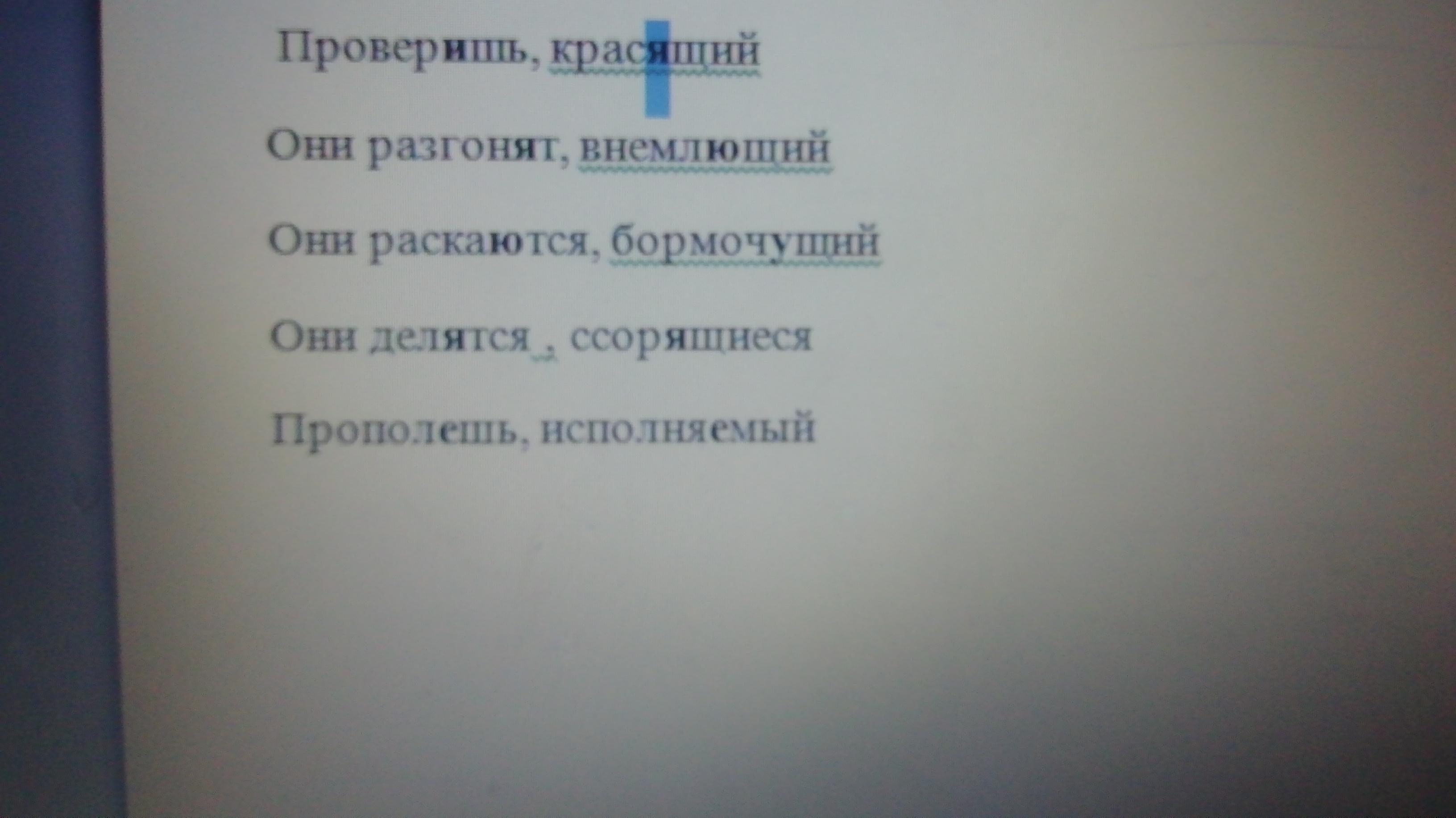 Поверишь, красящий, (они) разгонят, внемлющий, (они) раскаются, ссорящиеся, прополешь, исполняемый.