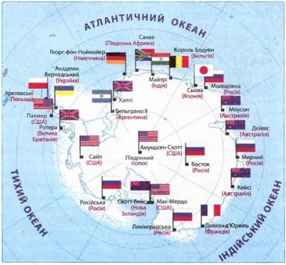 - За малюнком 69 установіть, які держави здійснюють наукові дослідження в Антарктиді. З’ясуйте, у яких частинах материка та з яких причин розташована більшість полярних станцій.