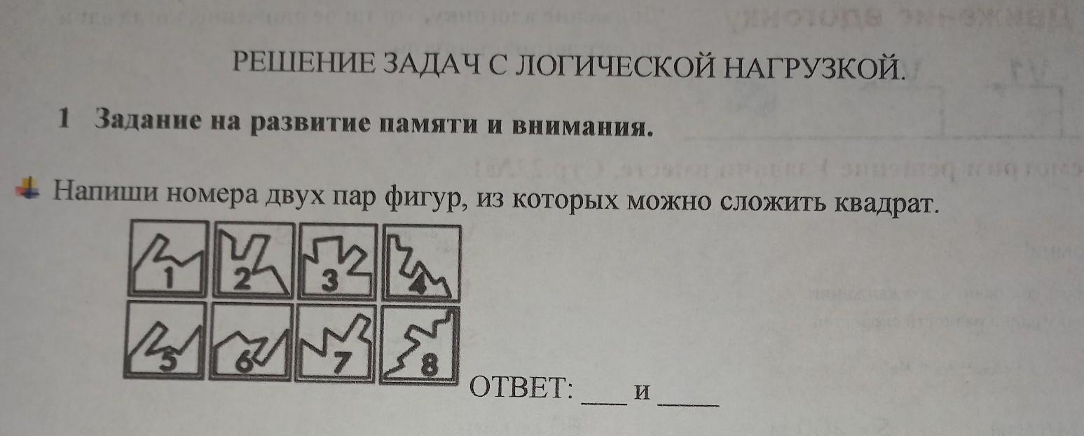 РЕШЕНИЕ ЗАДАЧС ЛОГИЧЕСКОЙ НАГРУЗКОЙ. 1 Задание на развитие памяти и внимания. 4 Напиши номера двух пар фигур, из которых можно сложить квадрат. 2 л Е ОТВЕТ:____и____
