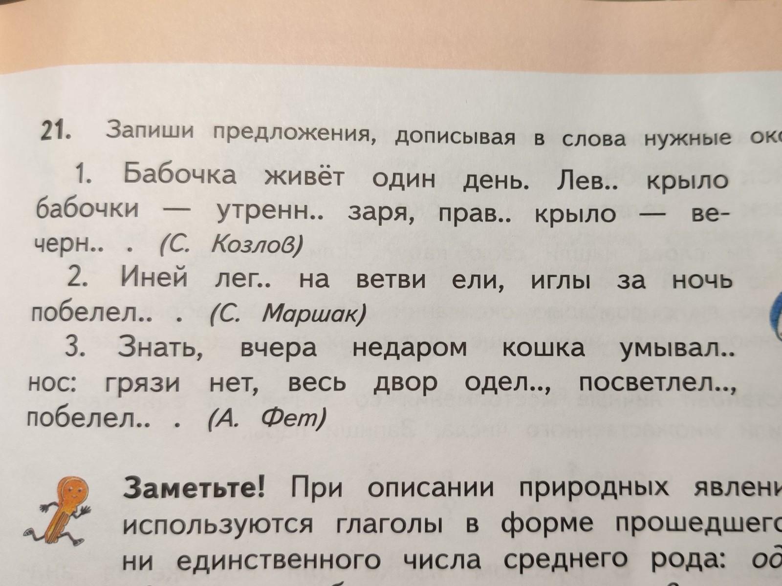 21. B Запиши предложения, дописывая слова нужные окончания. 1. Бабочка живёт один день. Лев.. Лев., крыло бабочки утренн.. заря, прав.. крыло ве- черн.. . (С. Козлов) 2. Иней лег.. на ветви ели, иглы за НОЧЬ побелел.. (С. Маршак) 3. Знать, вчера недаром Кошка умывал.. НОС, грязи нет, весь двор одел.., Посветлел.., побелел.. (А. Фет)