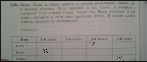 Петя, Ваня и Саша учатся в одной начальной школе, но в разных классах. Петя перешел в тот класс, в котором в прошлом году учился Саша, а через год Ваня перейдет в тот класс, который в этом году закончит Петя. В каком классе учится каждый из мальчиков?