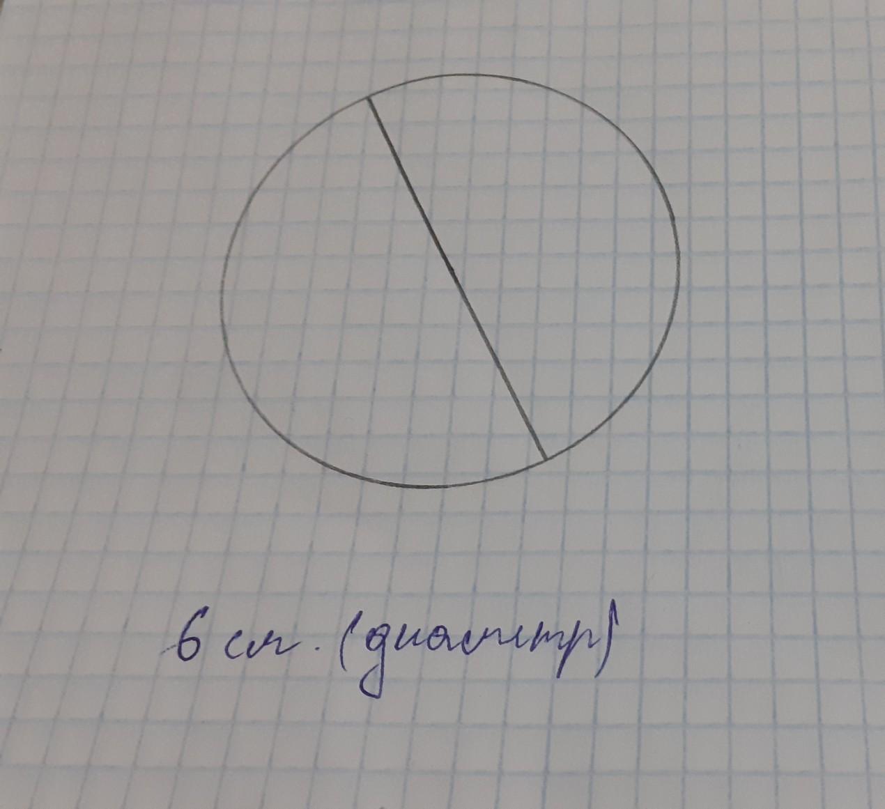 Диаметр равен 6 см. Чтобы начертить диаметр, нужно провести прямую линию так, чтобы окружность делилась пополам. Проще говоря, прям по точке, которую проколола игла циркуля.