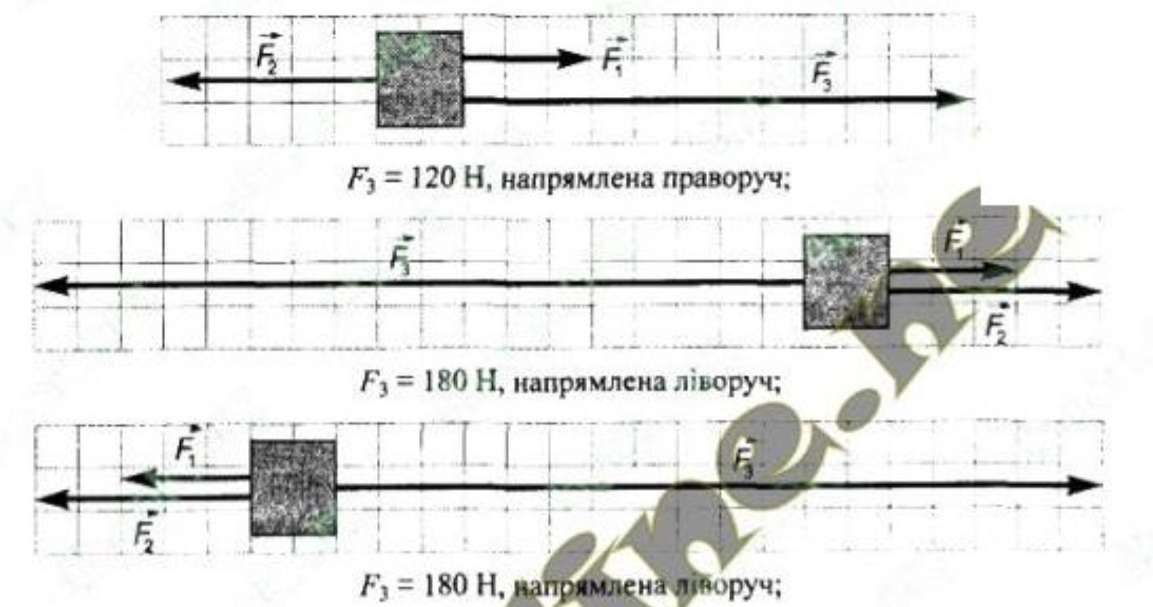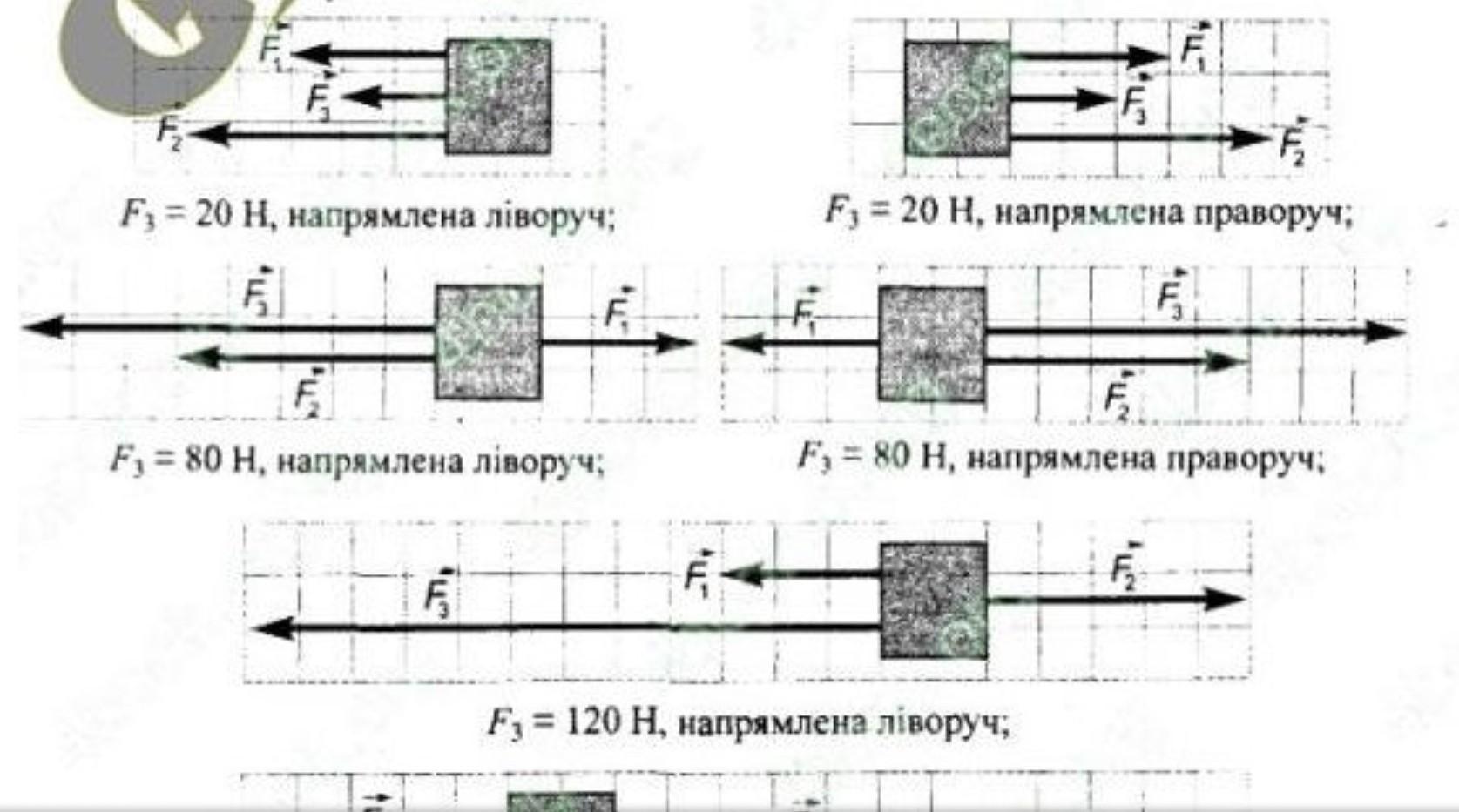7. На тіло діють три сили, напрямлені вздовж однієї прямої. Дві сили мають значення 30 і 50 н. Яке значення може мати третя сила, якщо рівнодійна трьох сил дорівнює 100 Н? Скільки розв'язків має ця задача? Виконайте в зошиті відповідні схематичні рисунки.