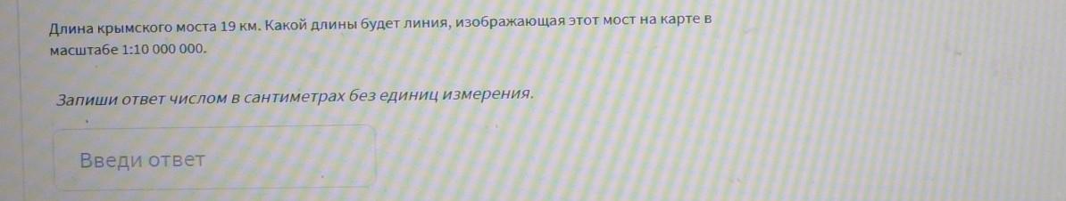 Длина крымского моста 19 км. Какой длины будет линия, изображающая этот мост на карте в масштабе 1:10 000 000. Запиши ответ числом в сантиметрах без единиц измерения.