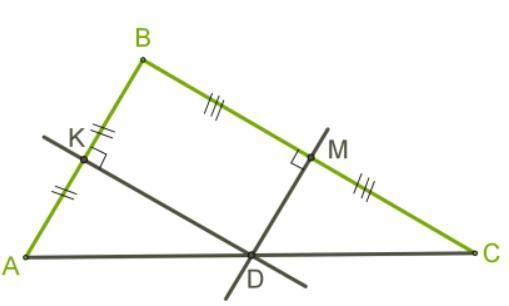 Известно, что точка пересечения серединных перпендикуляров сторон AB и BC треугольника ABC находится на стороне AC. Определи длину отрезков, в которых точка D делит сторону AC, если AC=6 cм
