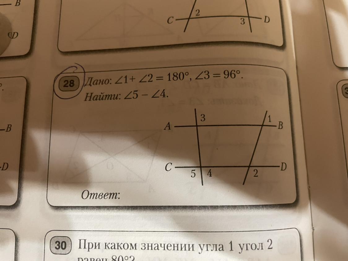 ∠1+∠2=180° ⇒ АВ║CD ⇒ ∠5=∠3=96°, ∠4=180-96=84°,