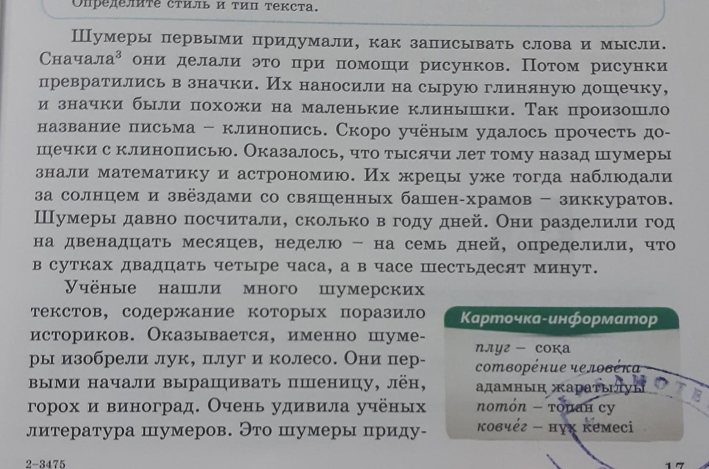 Шумеры первыми придумали, как записать слова и мысли. Сначала они делали это при помощи рисунков. Потом рисунки превратились в значки. Их наносили на сырую глиняную дощечку, и значки были похожи на маленькие клинышки. Так произошло название письма – клинопись. Скоро учёным удалось прочесть дощечки с клинописью. Оказалось, что тысячи лет тому назад шумеры знали математику и астрономию. Их жрецы уже тогда наблюдали за солнцем и звёздами со священных башен-храмов – зиккуратов. Шумеры давно посчитали, сколько в году дней. Они разделили год на двенадцать месяцев, неделю – на семь дней, определили, что в сутках двадцать четыре часа, а в часе шестьдесят минут.