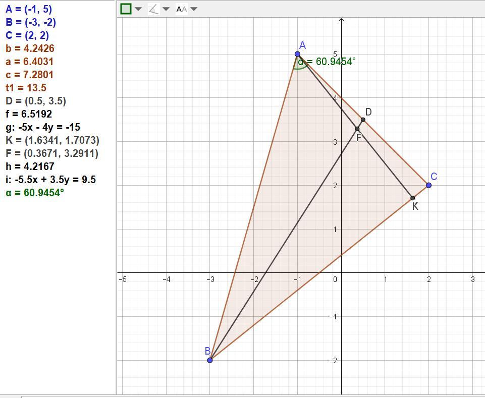 D = (A(-1;5) + C(2;2)) / 2 = (0,5; 3,5).