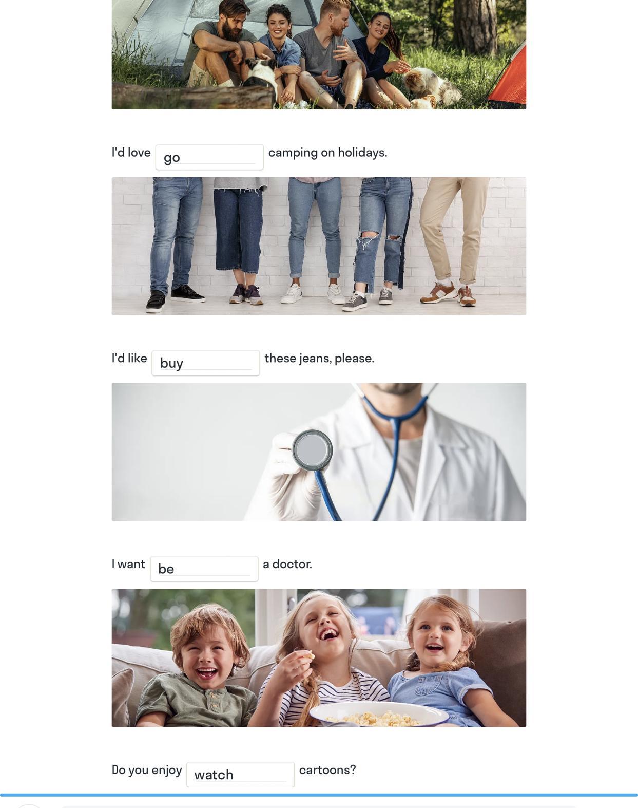 look at the pictures and fill in the gaps to make the sentences using unfinitive or gerund