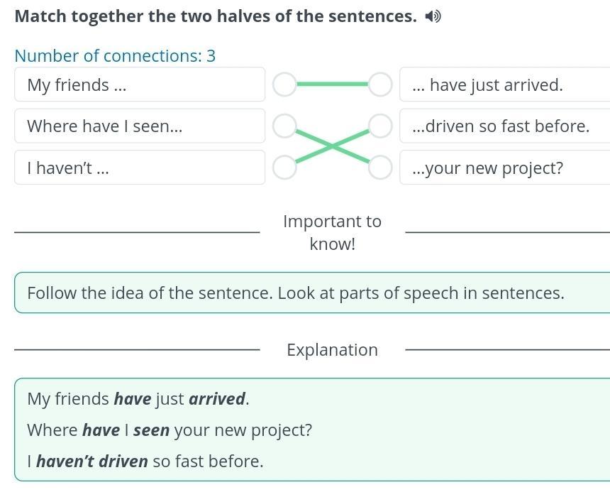Match together the two halves of the sentences. 1) Number of connections: 3 My friends ... ... have just a Where have I seen... ...driven so fa I haven't ... ...your new pro Check