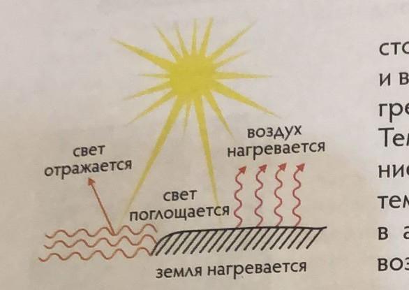когда солнце встаёт, она начинает освешять Землю и Земля поглашяет лучи солнца, солнце же в свою очередь нагревает земляной слой Земли. Достигнув земной поверхности, солнечные лучи нагревают её, а нагретая земная поверхность в свою очередь отдаёт тепло в воздух, но вода отражает лучик солнца