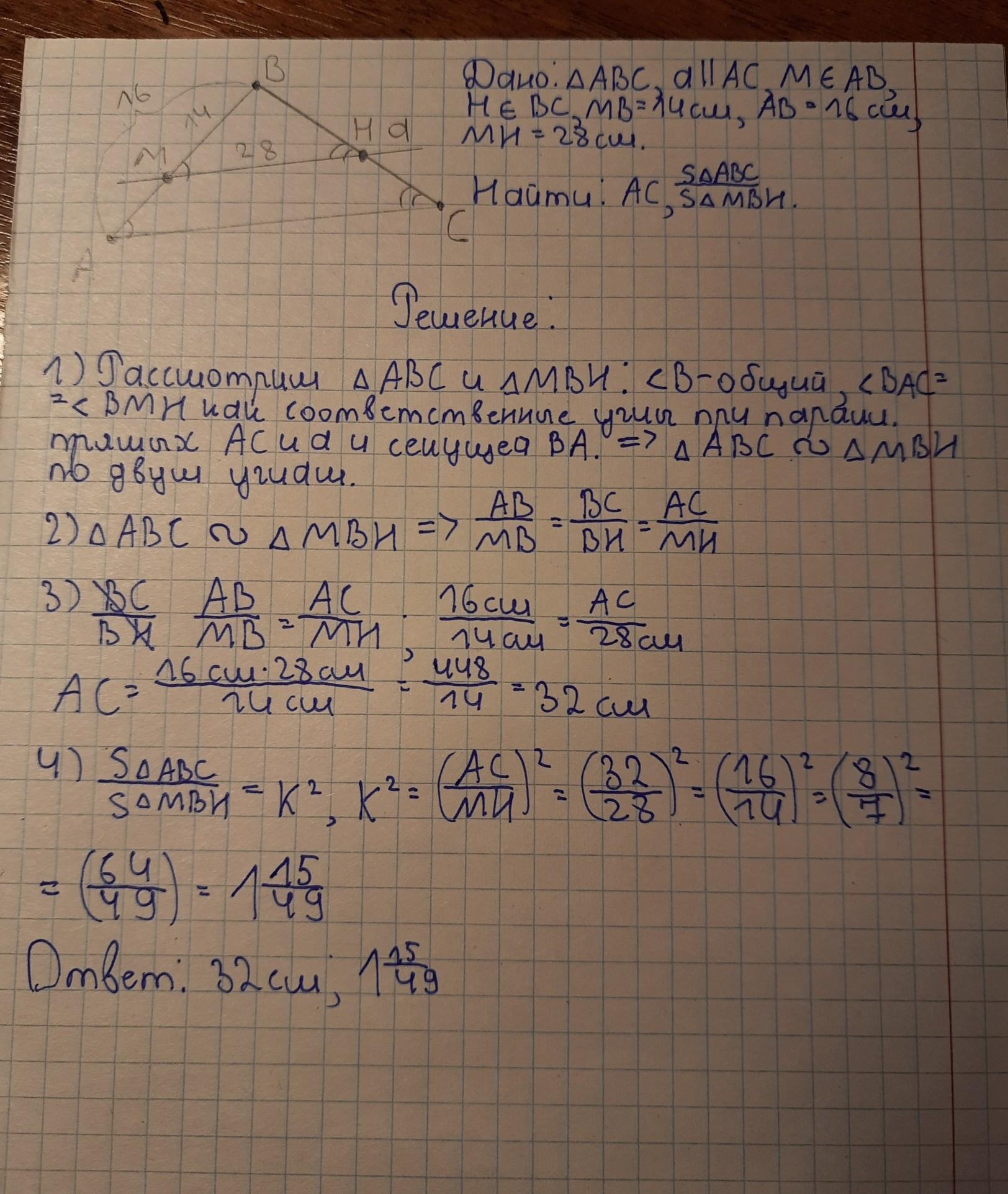 2. Прямая, параллельная стороне АС треугольника АВС, пересекает стороны АВ и ВС соответственно в точках М и Н. Найдите АС и отношение площадей треугольников АВС и ВМН, если МВ = 14 см, АВ = 16 см, МН = 28 см.