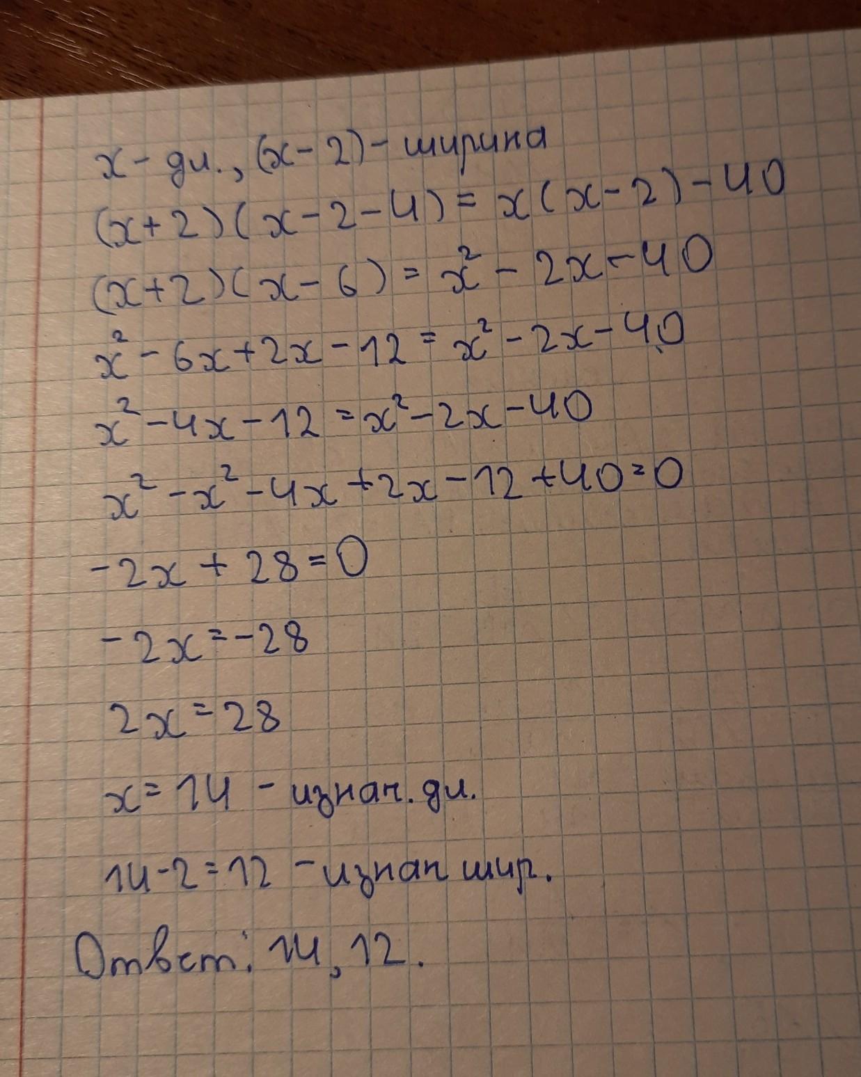 ДАЮ МНОГО БАЛЛОВ!!!Длина прямоугольника на 2 см больше его ширины. Если длину увеличить на 2 см, а ширину уменьшить на 4 см, то площадь прямоугольника уменьшится на 40 см^2. Найдите исходные длину и ширину прямоугольника.