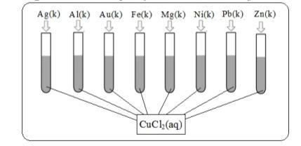 В восемь пробирок с раствором CuCl₂ бросали разные металлы. Используйте рисунок для обозначения реакции замещения в нескольких пробирках.