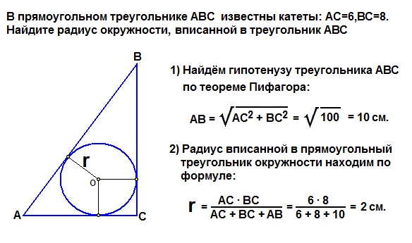 В прямоугольном треугольнике авс с прямым углом с известны катеты АС=6,ВС=8.Найдите радиус окружности,вписанной в треугольник АВС