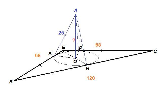 Основание и боковая сторона равнобедренного треугольника равны 120 см и 68 см соответственно. Точка A находится на расстоянии 25 см от каждой прямой, содержащей сторону треугольника. Проекцией точки A на плоскость треугольника является точка, принадлежащая этому треугольнику. Найдите расстояние от точки A до плоскости треугольника.