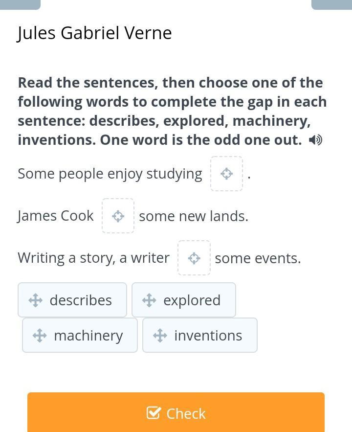 Read the sentences, then choose one of the following words to complete the gap in each sentence: describes, explored, machinery, inventions. One word is the odd one out.