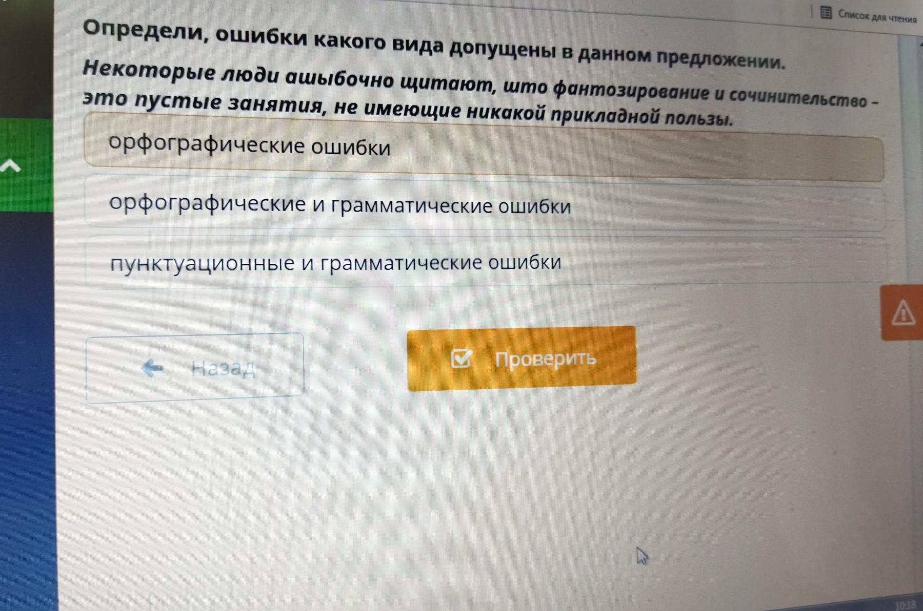 Определи, ошибки какого вида допущены в данном предложении. Некоторые люди ошибочно щитоюм што фантазирование и сочинительство - это пустые занятия, не имеющие никакой прикладной польз орфографические ошибки орфографические и грамматические ошибки пунктуационные и грамматические ошибки