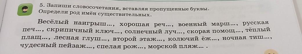 Весёлый наигрыш(м.р.),хорошая речь(ж.р.),военный марш(м.р.),русская печь(ж.р.),скрипичный ключ(м.р.),солнечный луч(м.р.),скорая помощь (ж.р.),тёплый плащ(м.р.),лесная глушь(ж.р.),второй этаж(м.р.),колючий ёж(м.р.),чудесный пейзаж(м.р.),спелая рожь(ж.р.),морской пляж(м.р.)