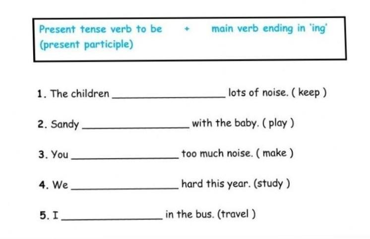 Task-1. 1.The children ......................lost of noise (keer). 2. Sandy....................... with the boby .(play). 3. You ..............too much noise (make). 4. We......................... hair this year (study). 5. I....................... in the bus (travel)