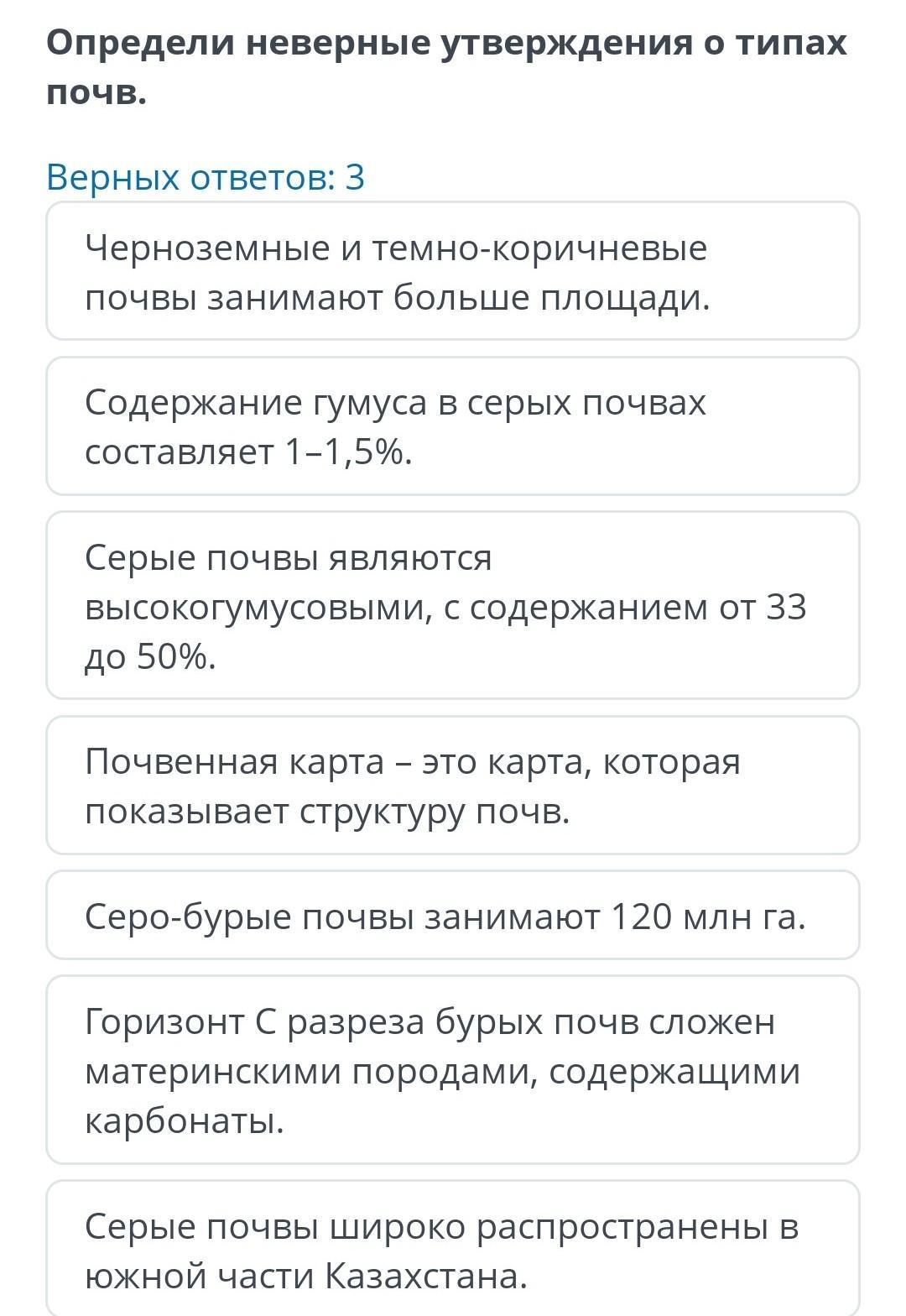 Типы почв в Казахстане Верных ответов: 3 Черноземные и темно-коричневые почвы занимают больше площади. Содержание гумуса в серых почвах составляет 1–1,5%. Серые почвы являются высокогумусовыми, с содержанием от 33 до 50%. Почвенная карта – это карта, которая показывает структуру почв. Серо-бурые почвы занимают 120 млн га. Горизонт С разреза бурых почв сложен материнскими породами, содержащими карбонаты. Серые почвы широко распространены в южной части Казахстана.