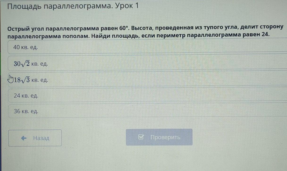 параллелограмма пополам. Найди площадь, если периметр параллелограмма равен 24.