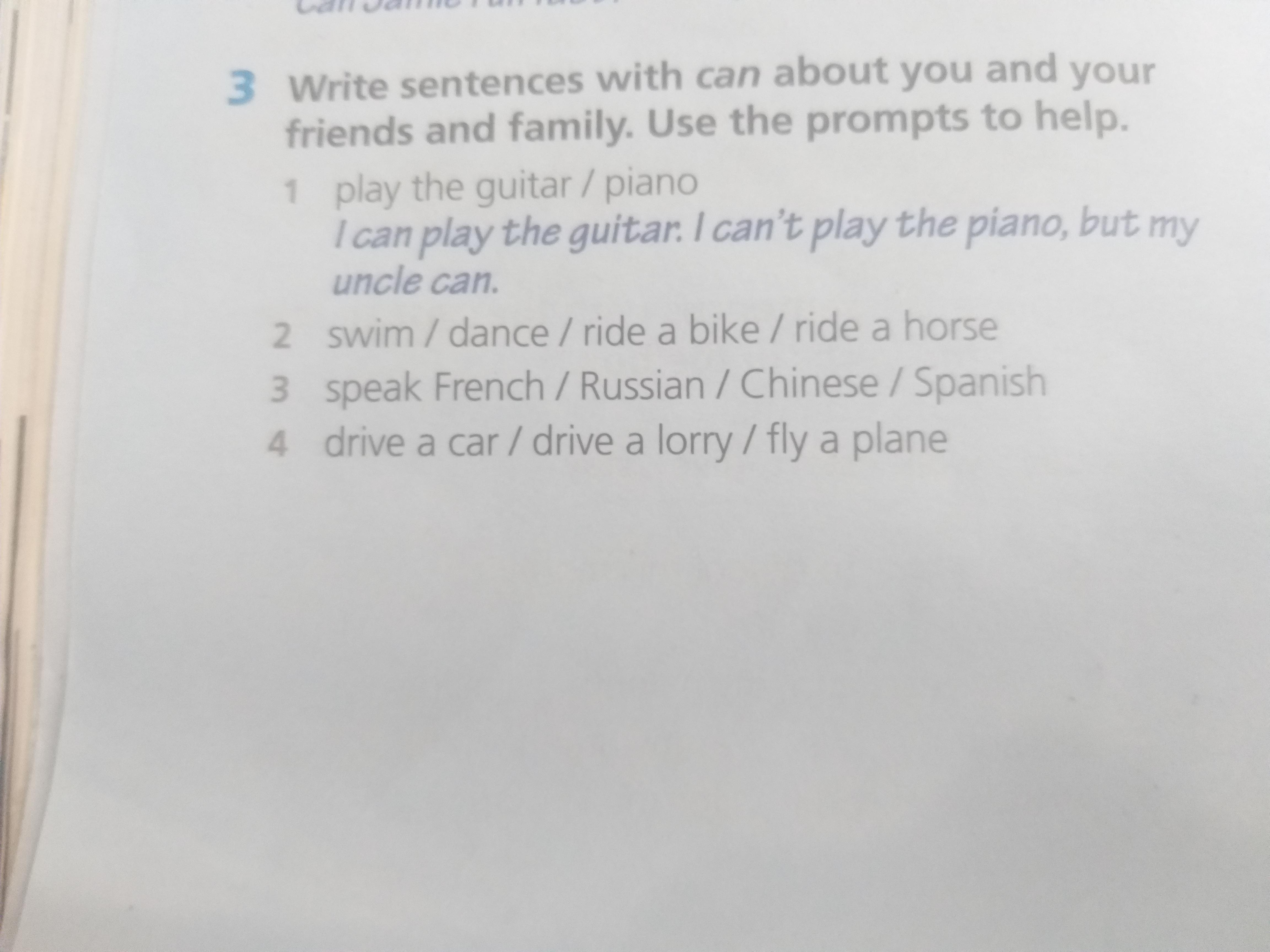 I can drive a car. I can't drive a lorry, but my uncle can. My mom can't fly a plane, but my friend can.