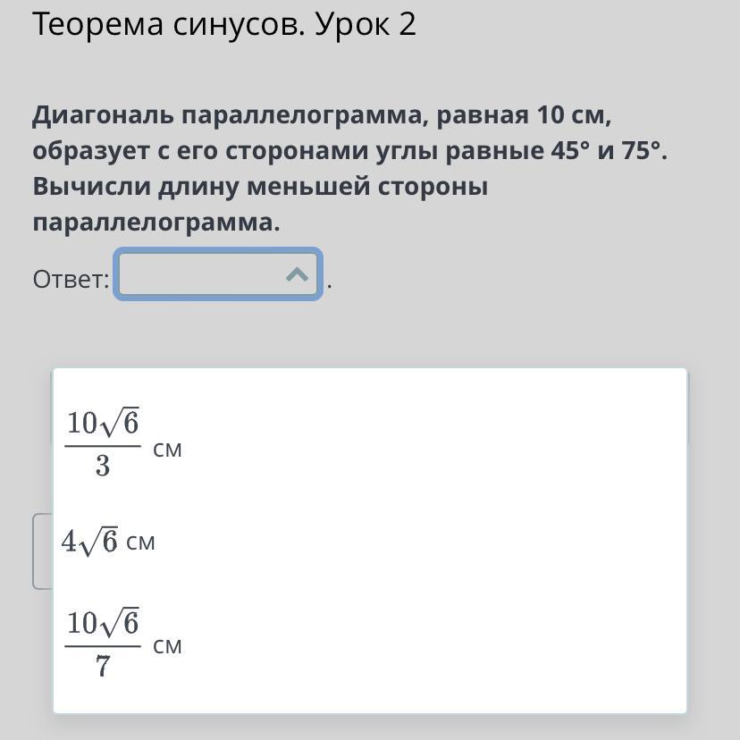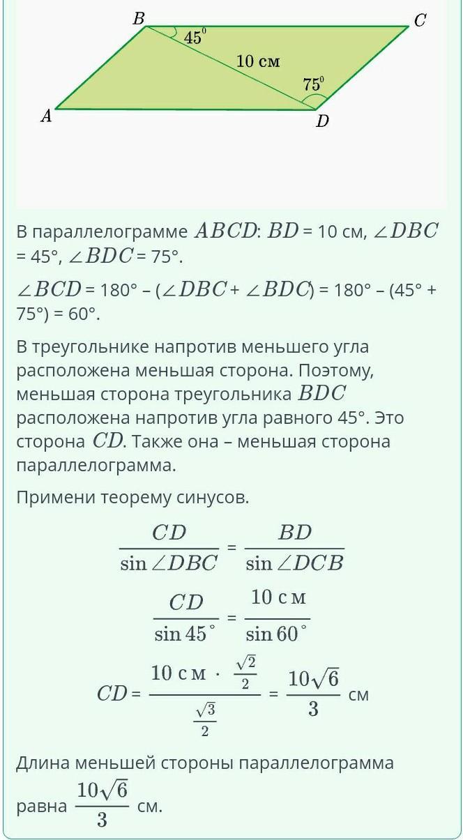 Диагональ параллелограмма, равная 10 см, образует с его сторонами углы равные 45° и 75°. Вычисли длину меньшей стороны параллелограмма.