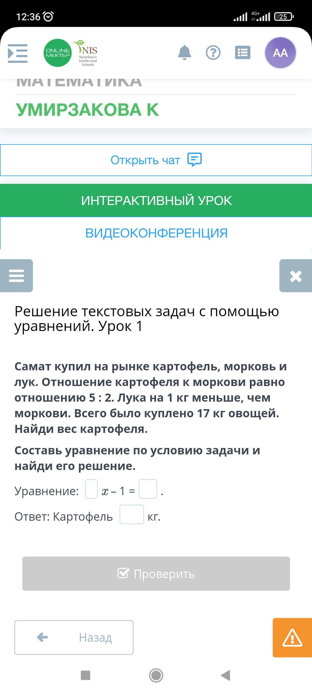 Самал купила на рынке картофель, морковь и лук. Отношение картофеля к моркови равно отношению 5 : 2. Лука на 1 кг меньше, чем моркови. Всего было куплено 17 кг овощей. Найди вес картофеля.