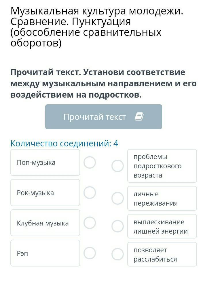 Музыкальная культура молодежи. Сравнение. Пунктуация (обособление сравнительных оборотов) Прочитай текст. Установи соответствие между музыкальным направлением и его воздействием на подростков. Количество соединений: 4 проблемы Поп-музыка подросткового возраста Рок-музыка личные переживания Клубная музыка выплескивание лишней энергии позволяет Рэп расслабиться ПОМОГИТЕ СРОЧНО ПЖЖЖЖЖЖЖЖЖЖЖ Я ДАМ 100 БАЛЛ