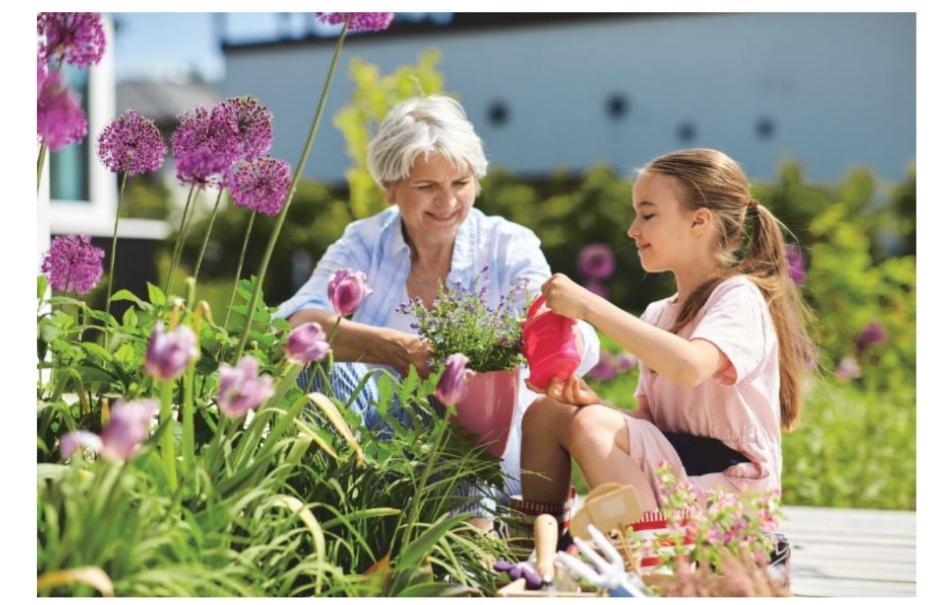 На фотографи запечатлели девочку и ее бабушку (скорее всего). На фотографии они сажают цветы (ухаживают за ними) в ихнем саду.