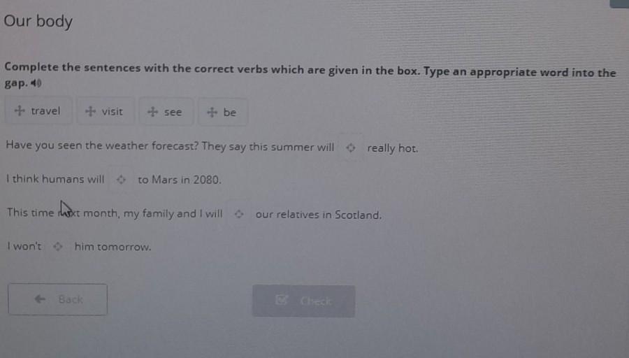 Our body Complete the sentences with the correct verbs which are given in the box. Type an appropriate word into the gap. - 4 travel visit be see be Have you seen the weather forecast? They say this summer will be really hot. I think humans will to Mars in 2080. This time next month, my family and I will our relatives in Scotland. I won't him tomorrow