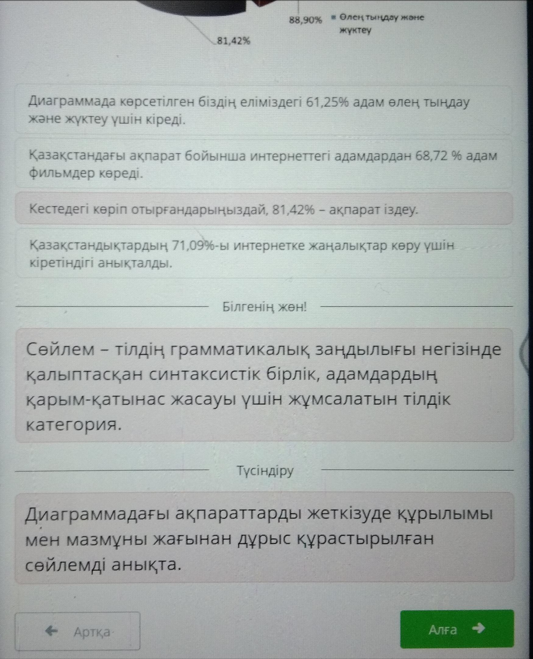 Графиктік ақпаратты жеткізуде дұрыс құрастырылған сөйлемді анықта. BLIM Land 61,25% 68,72% а Фильмдер көру 71,09% л Электрондық пошта o Ақпарат іздеу а Жаңалықтар көру 88,90% на өлең тыңдау және жүктеу _81,42% 1.Диаграммада көрсетілген біздің еліміздегі 61,25% адам өлең тыңдау және жүктеу үшін кіреді.