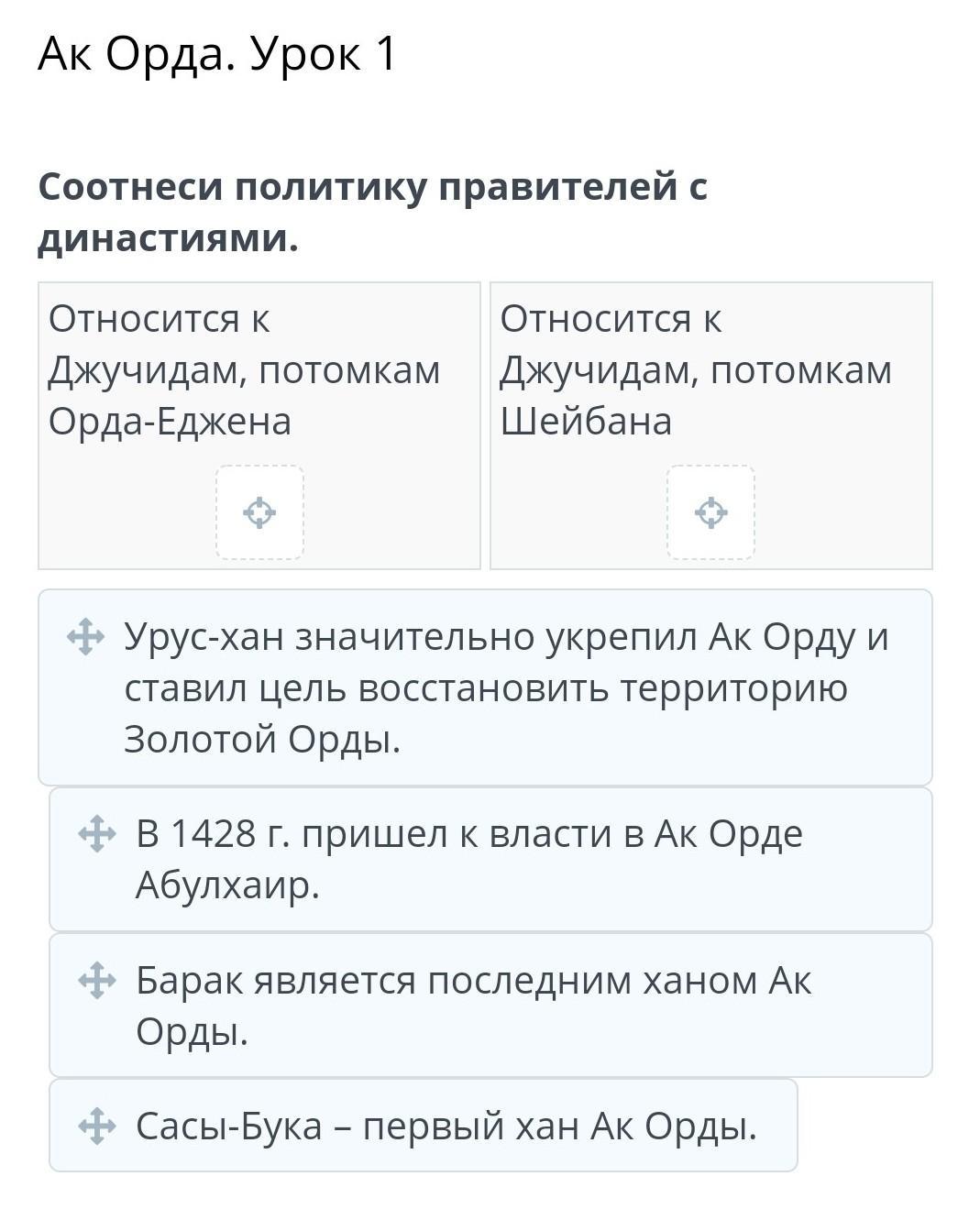 Ак Орда. Урок 1 Соотнеси политику правителей с династиями. Относится к Джучидам, потомкам Орда-Еджена Относится к Джучидам, потомкам Шейбана Урус-хан значительно укрепил Ак Орду и ставил цель восстановить территорию ЗОЛОТОЙ Орды. в 1428 г. пришел к власти в Ак Орде Абулхаир. Барак является последним ханом Ак Орды. Сасы-Бука - первый хан Ак Орды.