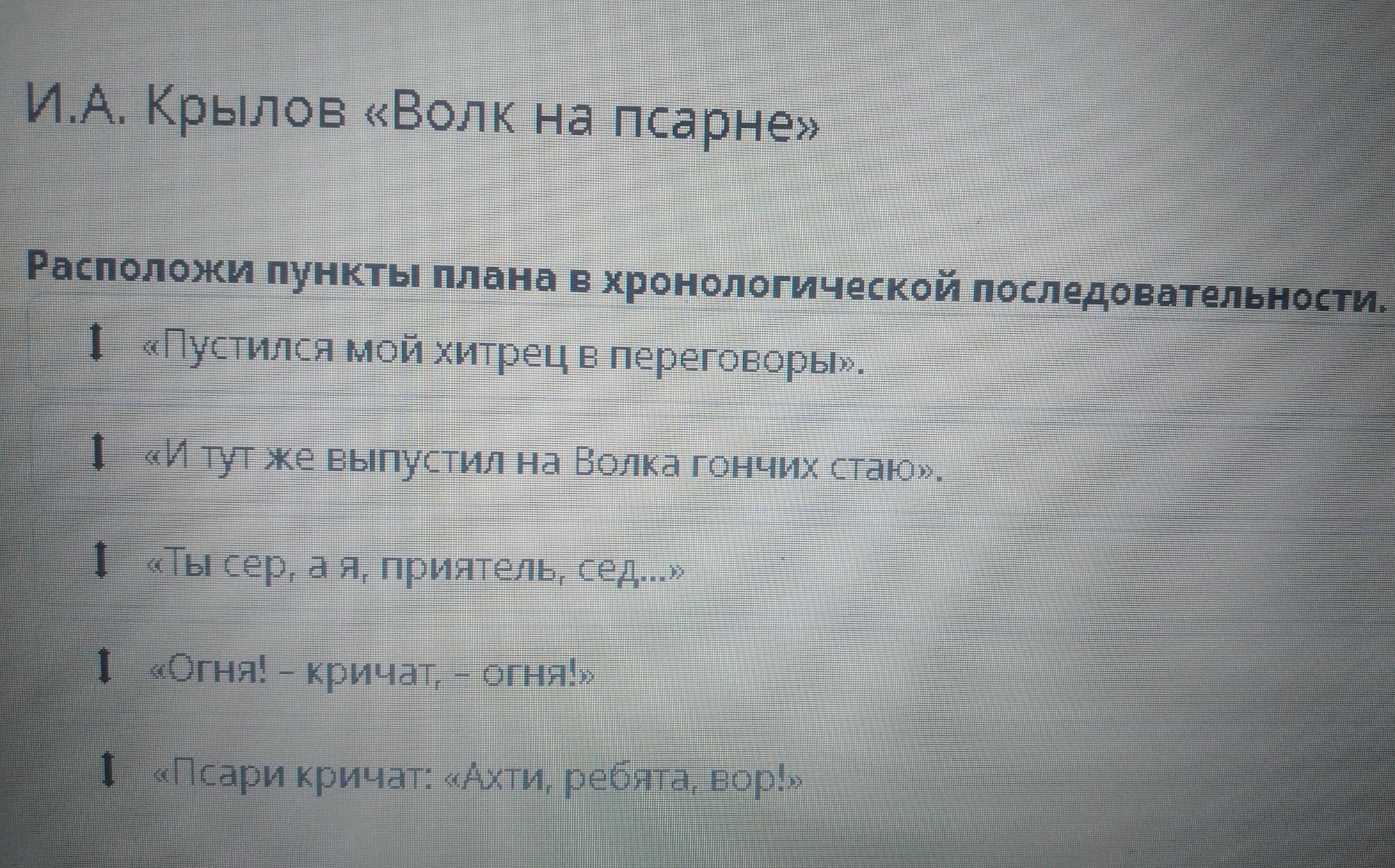 И.А. Крылов «Волк на псарне» Расположи пункты плана в хронологической последовательности. «Пустился мой хитрец в переговоры». I «И тут же выпустил на Волка гончих стаю». І «Ты серая, приятель сед...» «Огня! - кричат, — огня!» ТАПсари кричат: «Ахти, ребята, вор!»