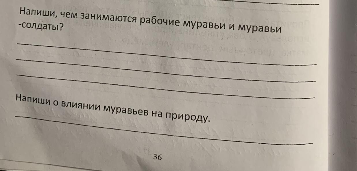 Ответ: рабочие муравьи строят норки, кормят маленьких муравьёв, а муравьи солдаты добывают пищу и тд.(помогать я не умею)