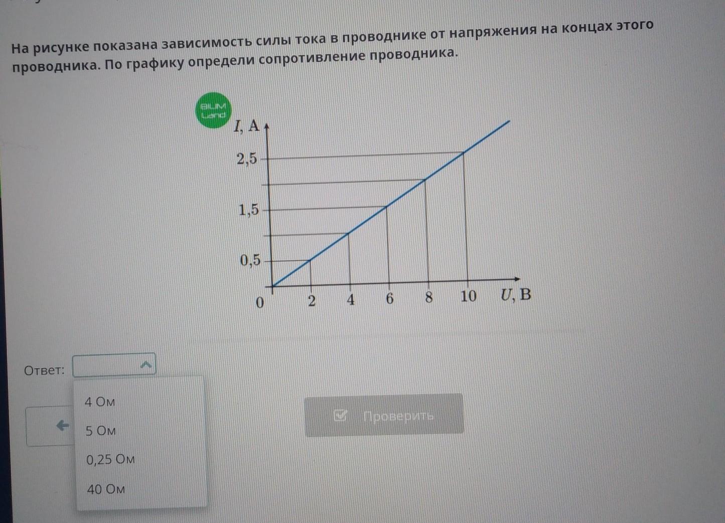 R = U/I = 10/ 2.5 = 4 Ома