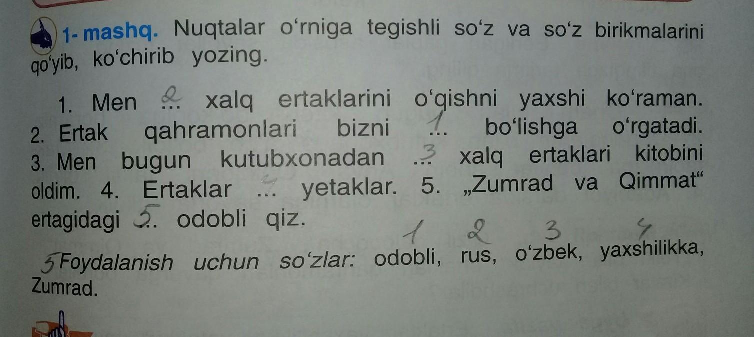 24- yanvar .Mavzu: Ertaklar olamida.// Jo'nalish kelishigining qo'llanilishi. 95- bet.1- mashq.96- bet 2- mashq. Uygal vazifa: 95- bet Ertaklar yaxshilikka yetaklar mavzusida matn tuzish.// 98- bet "Oygul bilan Baxtiyor she'rini yodlash. помогите пжпжпж даю 15 баллов