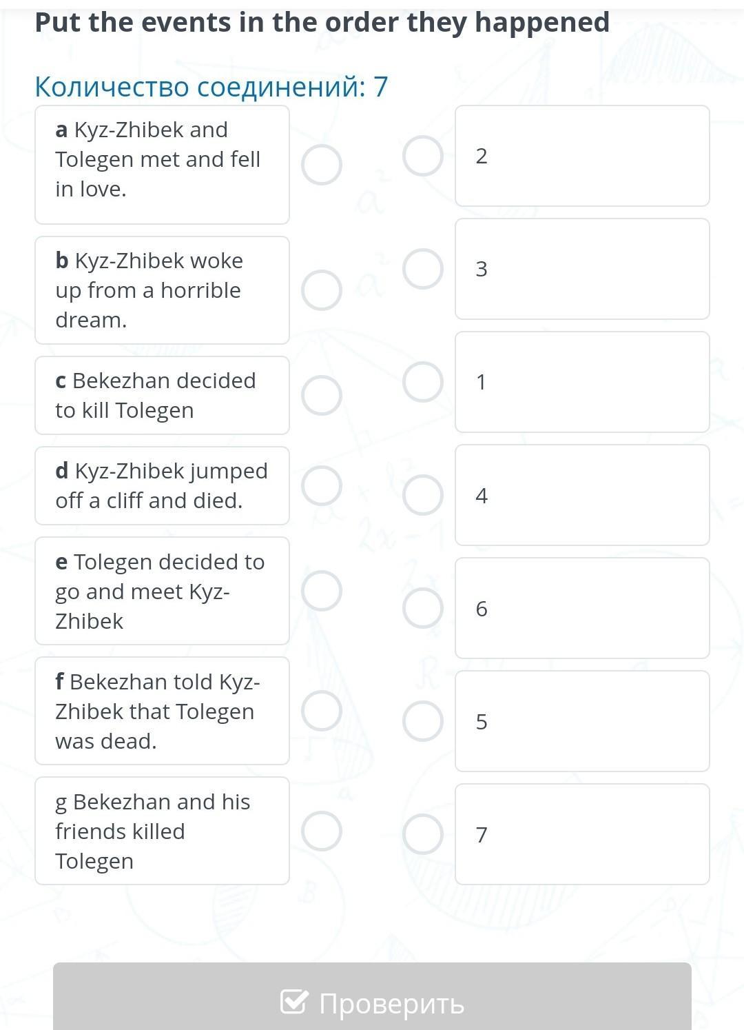Put the events in the order they happened a Kyz-Zhibek and Tolegen met and fell in love. 24 ЯНВАРЯ c Bekezhan decided to kill Tolegen b Kyz-Zhibek woke up from a horrible dream. ИБРАЕВА А d Kyz-Zhibek jumped off a cliff and died. e Tolegen decided to go and meet Kyz-Zhibek f Bekezhan told Kyz-Zhibek that Tolegen was dead. g Bekezhan and his friends killed Tolegen 2 3 1 4 6 5 7