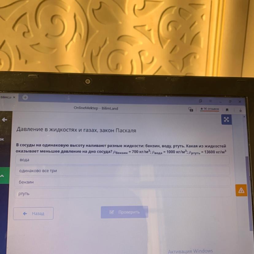 ρ(бензина) = 700 кг/м³; ρ(воды) = 1000 кг/м³; ρ(ртути) = 13600 кг/м³.