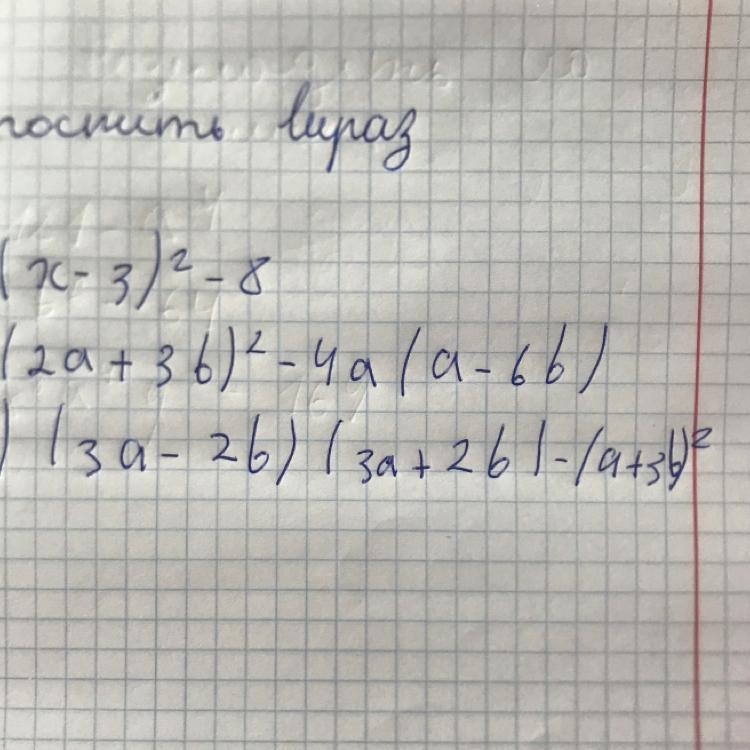 (3a - 2b)(3a + 2b) -  {(a + 3b)}^{2}  =  {9a}^{2}  -  {4b}^{2}  - ( {a}^{2}  + 6ab +  {9b}^{2} ) =  {9a}^{2}  -  {4b}^{2}  -  {a}^{2}   - 6ab -  {9b}^{2}  =  {8a}^{2}  -  {13b}^{2}  - 6ab