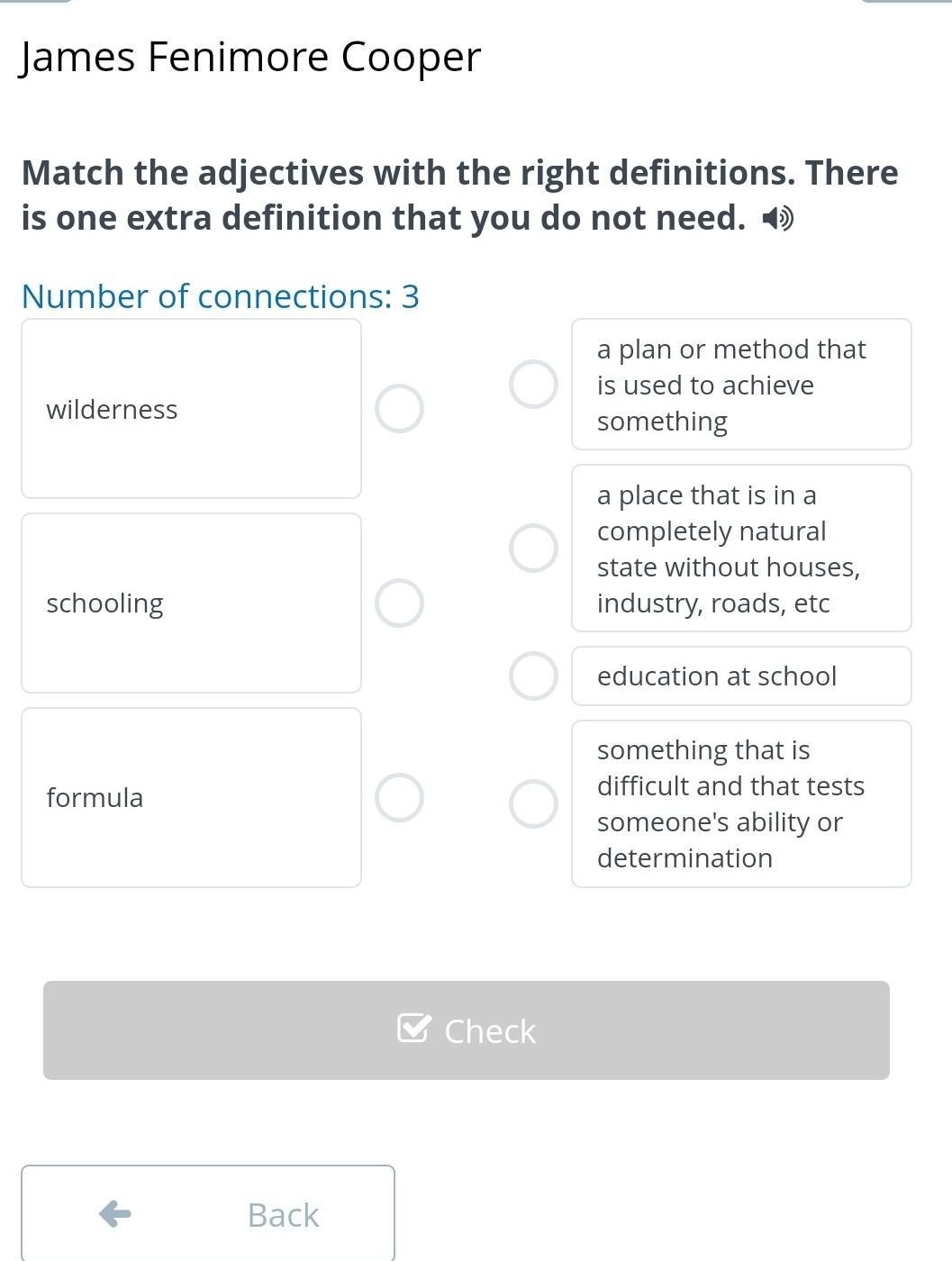 Срочно помогите пожалуйста!! Match the adjectives with the right definitions. There is one extra definition that you do not need. 1) Number of connections: 3 a plan or method that is used to achieve something wilderness a place that is in a completely natural state without houses, industry, roads, etc schooling O O education at school formula something that is difficult and that tests someone's ability or determination
