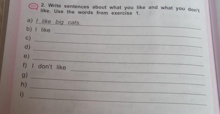 2. Write sentences about what you like and what you don't like. Use the words from exercise 1. a) I like big cats b) 1 illike c 0 e 1) I don't like 9 h)