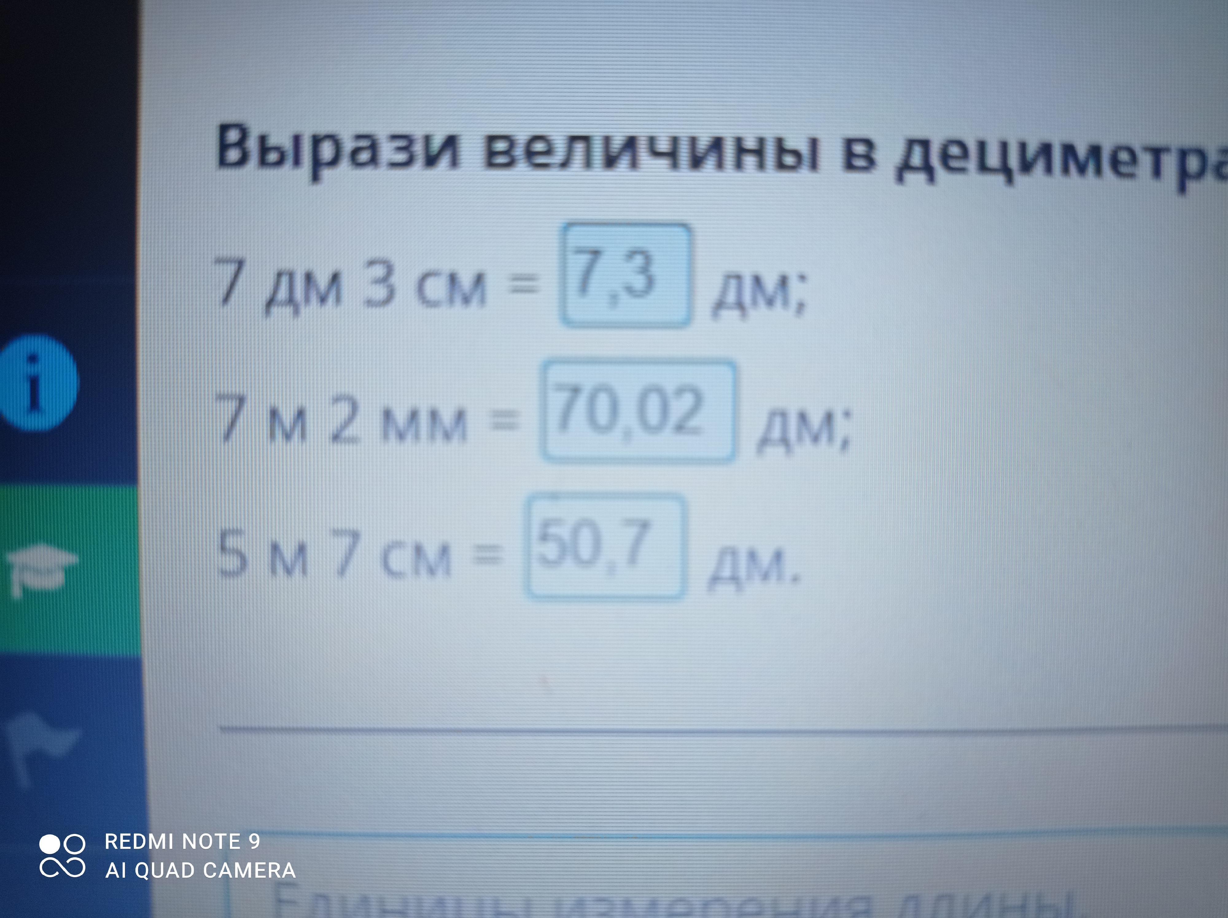 Вырази величины в дециметрах с помощью десятичных дробей. 7 дм 3 см = Дм; 7 м 2 MM = Дм; 5 м 7 см = Дм.