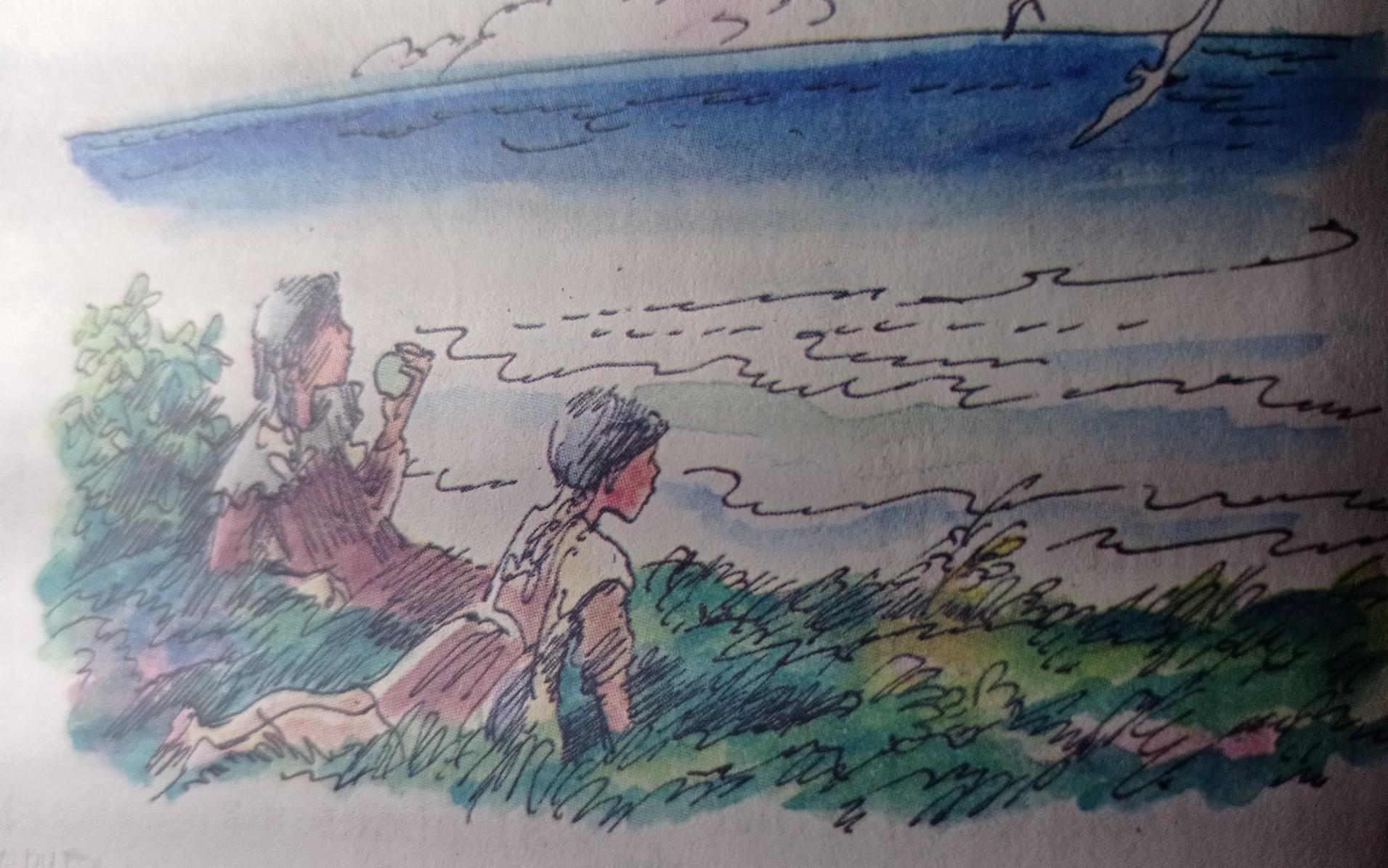 еще я вижу на этой картине то как сине-море слегка бьется своими волнами об этот прекрастный зеленый берег